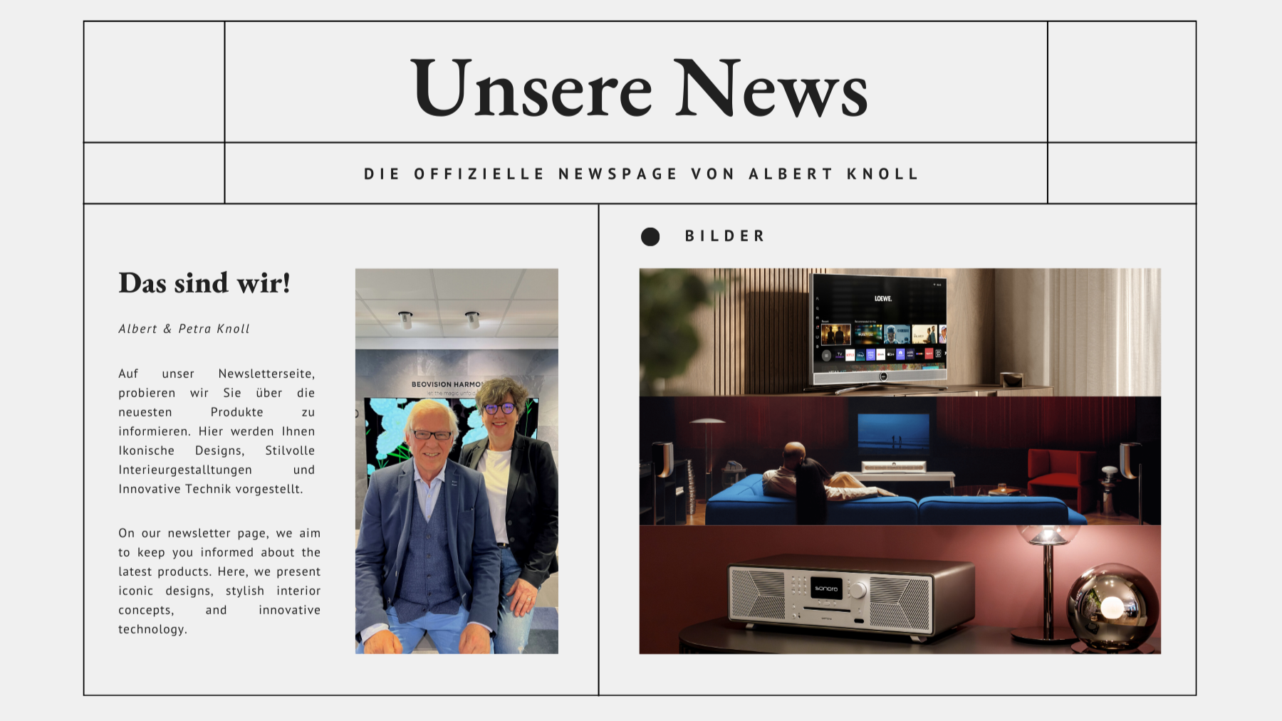 Wir liefern keine Produkte - wir liefern Lösungen. Sie suchen eine Musikanlage, die edel klingt und auch so aussieht? Oder eine Satellitenanlage für das störungsfreie Fernsehbild? Bei uns erwartet Sie ein kompetenter Rundum-Service. Als inhabergeführtes Familienunternehmen sind wir klein genug für individuelle Beratung, aber auch groß genug für anspruchsvolle Projekte. Oder mit anderen Worten: Wir sind Ihr perfekter Ansprechpartner, wenn es um Lösungen für das einzigartige Klang- und Fernseherlebnis geht.